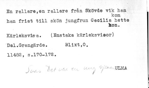 //// En rallare,en rallare från Skövde vik han //// kom //// han friat till skön jungfrun Cecilia hette //// hon. //// * //// Kärleksvisa. (Enstaka kärleksvisor) //// Dal.Grangärde. Blixt,0. //// 11482, s.170-172. //// < //// H ////