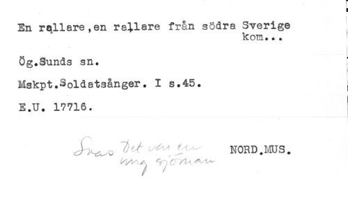 //// ) //// En rqllare,en rallare från södra Sverige //// kom... //// i //// Ög.Sunds sn. ' //// Mskpt.Soldatsånger. I s.45. //// ! //// E.U. 17716. //// ---- //// J^,. NORD .HUS. //// / ' ////