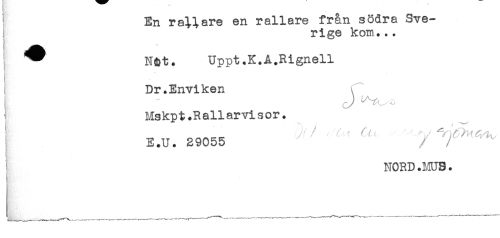 //// * En rallare en rallare från södra Sve- //// i rige kom... //// ^ Nj}t. Uppt.K.A.Rignell //// Dr.Enviken //// ) //// /^ Mskpt.Rallarvisor. //// E.U. 29055 / //// /' NORD.MUS. //// ^___-----.---- ----^ - ^ - ^ ^ ////