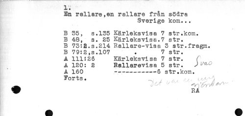 //// En rallare,en rallare från södra //// Sverige kom... //// B 35, s.135 Kärleksvisa 7 str.kom. //// B 48, s. 25 Kärleksvisa.7 str. //// B 75:2.s.214 Rallare-visa 5 str.fragm. //// B 79:2,s.107 . 7 str. //// A 11H26 Kärleksvisa 7 str. ^ //// A 120: 2 Rallarevisa 5 str. //// A 160 -----6 str.kom. //// Forts. t , ////
