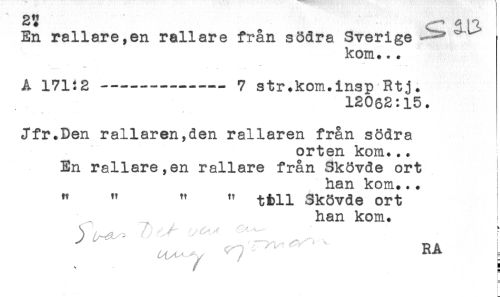 //// 2+ „ ^ ' -[3 //// En rallare,en rallare från södra Sverige -^ //// kom. *. //// - . . ^ ^ * //// A 171:2 ---- 7 str.kom.insp Rtj. //// 12062:15. //// Jfr.Den rallaren,den rallaren från södra //// orten kom... //// En rallare,en rallare från Skövde ort i //// han kom... //// " " " " t&Ll Skövde ort //// han kom. //// ^^ } //// ^ y RA ^ //// 5 ////