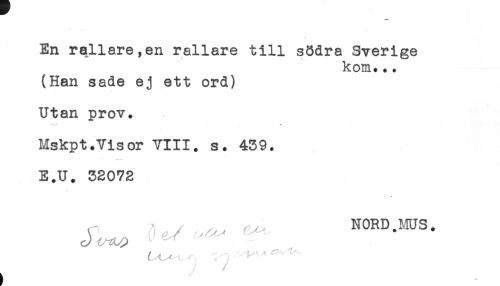 //// -* //// En rallare,en rallare till södra Sverige //// kom... //// (Han sade ej ett ord) //// Utan prov. //// ^n* * //// Mskpt.Visor VIII. s. 439. //// t-* ** //// E.U. 32072 //// * //// - , ^ NORD. MUS. //// . i * //// //// /