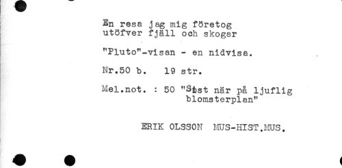 //// En resa jag mig företog //// utöfver fjäll och skogar //// .<* * //// "Pluto"-visan - en nidvisa. //// Bn. -' //// K ^ //// Nr.50 b. 19 str. //// * //// y.* . * . . //// Mel.not. : 50 "S> när på ljuflig //// blomsterplan^ //// ERIK OLSSON MUS-HIST.MUS. ////