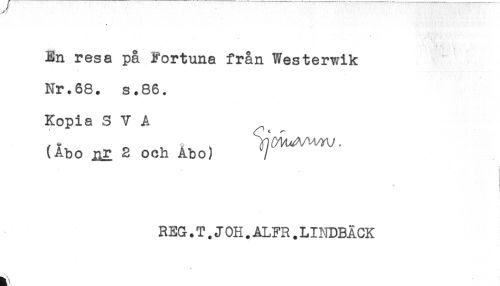 //// En resa på Fortuna från Westerwik //// Nr.68. s.86. //// Kopia SVA //// (Abo jir 2 och Abo) 7 //// REG.T.J OH.ALFR.LINDBÄCK ////