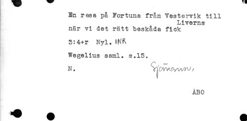 //// En resa på Fortuna från Vestervik till //// Liverns //// när vi det rätt beskåda fick //// 3:4+r Nyl. tf\'H //// Wegelius saml. s.15. //// ÅBO ////