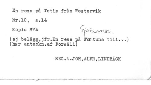 //// En resa på Tetis från Westervik //// Nr.10, s.14 //// Kopia SVA //// (ej belägg,jfr.En resa på Fcrtuna till...) //// (bar anteckn.af Forsäll) //// R EG.t.J OH.ALFR.LINDBÄCK //// _____ ___ ..... ...... ___ ^ ////