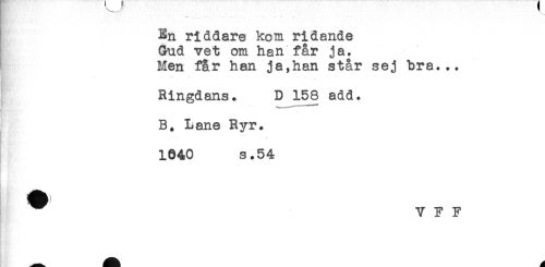 //// En riddare kom ridande //// Gud vet om han får ja. //// Men får han ja,han står sej bra... //// V' //// Ringdans. D 158 add. //// B. Lane Hyr. //// * //// 1040 s.54 //// _ //// ^ V F F ////