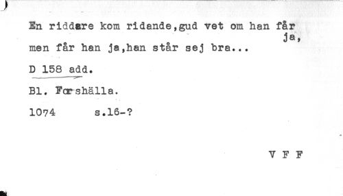 //// * . - .... //// En riddare kom ridande,gud vet om han får //// ja, //// men får han ja,han star sej bra... //// D 158 add. //// Bl. Fcrshälla. //// t ; //// 1074 S.16-? //// V F F ////