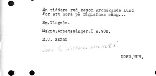 //// En riddare red genom grönskande lund //// *'ör att höra på fåglarnas s&ng... //// * * * //// Sm.Tingsås. //// - - - ... //// Mskpt.Arbetssånger.I s.905. //// E.U. 22365 //// t //// NORD.HUS. ////