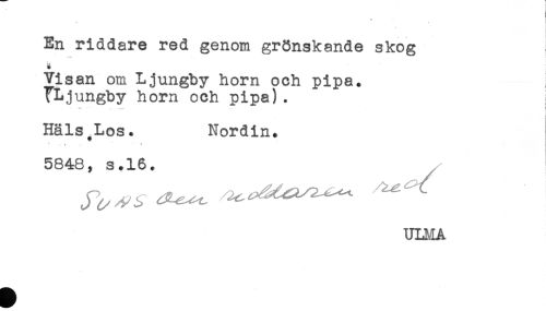 //// En riddare red genom grönskande skog } //// **** ^.t //// Visan om Ljungby horn och pipa. //// fLjungby horn och pipa) . //// -* * . .- i //// i //// Häls,Los. Nordin. //// ^ ^ . - * ** * ^ //// 5848, 3.16. //// UU^A ////