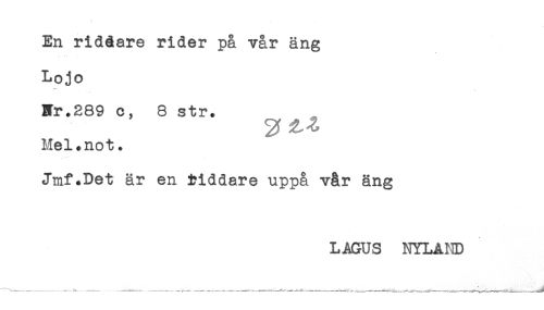 //// En riddare rider på vår äng //// Loj o //// Bfr.289 c, 8 str. //// Mel.not. //// Jmf.Det är en Riddare uppå vår äng //// LAGUS NYLAND ////