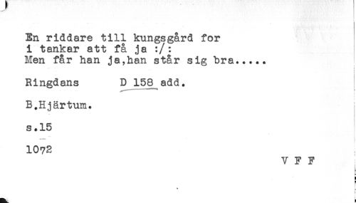 //// En riddare till kungsgård for //// i tankar att få ja :/: //// Men får han ja,han står sig bra..... //// i //// Ringdans D 158 add. //// B.Hjärtum. //// * //// s.15 //// - < //// 1072 //// V F F //// b //// jj ////