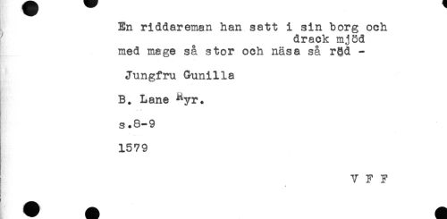//// En riddareman han satt i sin borg och //// drack mjöd //// med mage så stor och näsa så rgd - //// Jungfru Gunilla //// * //// t*' //// B. Lane Ryr. //// s.8-9 //// 1579 //// V F F ////