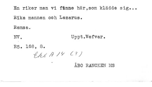 //// En riker man vi finne här,som klädde sig... //// Rika mannen och Lazarus. //// Ramsa. //// NV. Uppt.Wefvar. //// R5. 168, 8. //// ÅBO RANCKEN MS //// ....... ....... .... .... . - ... . .- ...... . . ...... . ^ ////