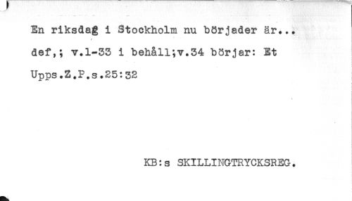 //// ' . . . - //// En riksdag i Stockholm nu börjader är... //// def,; v.1-33 i behåll;v.54 börjar: Et //// Upps.Z.F.s.25:32 //// ! //// i //// i //// * //// < //// KB:s SKILLINGTRYCKSREG. ////
