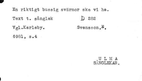 //// En riktigt bussig svärmor ska vi ha. //// Text t. sånglek D 282 //// t* //// Vgl.Karleby. Svensson,^. //// 6981, s.4 //// .U L M A //// SANGLEKAR. ////