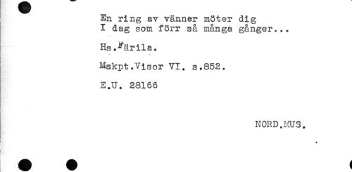 //// ; En ring av vänner möter dig //// ! I dag som förr så många gånger... //// Hs.Färila. //// Mskpt.Visor VI. s.852. //// E.U. 28166 //// B //// i //// NORD.MUS. //// t'. * ////