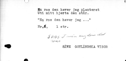 //// En ros den haver jag planterat //// Uti mitt hjerta den står. //// "En ros den haver jag ..." //// Nr,1 str. //// SÅWE GOTLÄNDSKA VISOR ////