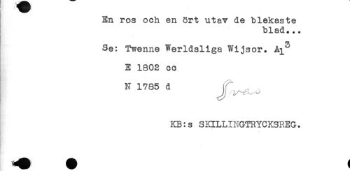 //// En ros och en ört utav de blekaste //// ! blad... //// Se: Twenne Werldsliga ??ijsor. A^ //// E 1802 cc //// iTss ^ jr^,. //// KB:s SKILLINGTRYCKSREG. //// Bi ////
