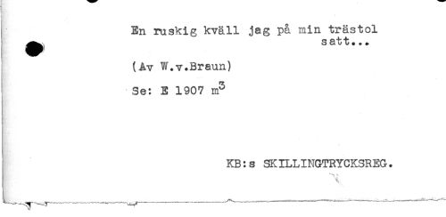 //// 't //// En ruskig kväll jag på min trästol //// ^^ satt... //// (Av W.v.Braun) //// Se: E 1907 m^ //// KB:s SKILLINGTRYCKSREG. //// L ' .__ //// ----'-----'-----^ " ^ ^ ////