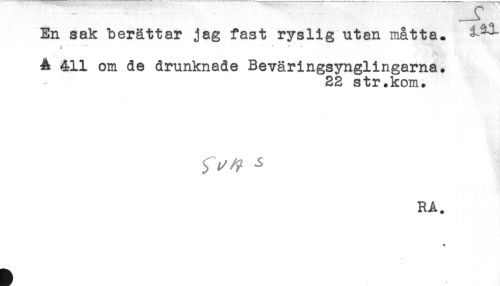 //// En sak berättar jag fast ryslig utan måtta. //// ;..... - - * ^ //// A 411 om de drunknade Beväringsynglingarna. //// 22 str.kom. //// RA. //// + ////