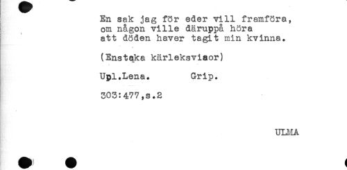 //// En sak jag för eder vill framföra, //// ! om någon ville däruppå höra //// I att döden haver tagit min kvinna. //// (Enstaka kärleksvisor) //// Upl.Lena. Grip* //// - //// 303:477,s.2 //// ULI.IA ////