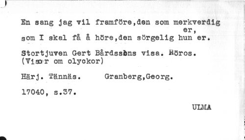 //// En sang jag vil framföra,den som merkverdig //// ' er, ! //// som I skal få å höre,den sörgelig hun er. ! //// ^ - ^ - .. t //// i //// , t //// * //// Stortjuven Gert Bårdssbns visa. Röros. //// (Visor om olyckor) //// Eärj. Tännäs. Granberg,Georg. I //// 17040, s.37. //// ULMA //// ' //// t //// < //// < //// !" //// E //// ! //// ? //// ! //// f //// c ////