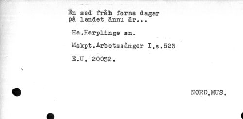 //// En sed fråh forna dagar //// på landet ännu är... //// * ** * //// Ha.Harplinge sn. //// Mskpt.Arbetssånger I.s.525 //// E.U. 20032. //// ^ NORD.MUS. ////