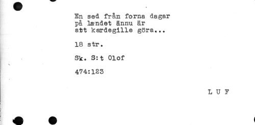 //// En sed från forna dagar //// på landet ännu är //// att kardegille göra... //// 18 str. //// Sk. S:t Olof //// ^ ' . .. //// 474:123 //// P //// L U F ////