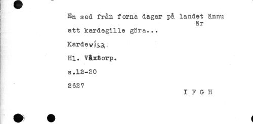 //// En sed från forna dagar på landet ännu //// är //// att kardegille göra... //// Kardev(s3 //// Hl. VåxBorp. //// * //// s.12-20 //// 2627 //// I F G H ////