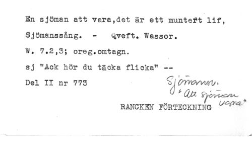 //// En sjöman att vara,det är ett munteft lif, //// Sjömanssång. - Qveft* Wassor. //// W. 7.2,5; oreg.omtagn. //// sj "Ack hör du täcka flicka" - //// Del II nr 773 //// RANCKEN FÖRTECKNING * //// ... ...... ...... ////