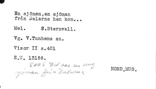 //// En^sjöman, en sjöman //// från Dalarna han kom... //// Mel. S.Sternvall. //// Vg. V.Tunhems sn. //// *** *** * * //// Visor II s.401 //// * < //// E.U. 13166. //// ^ - ^ . ^ NORD.MUS. ////