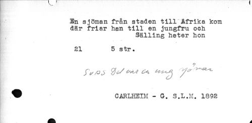 //// ... ... . ' //// En sjöman från staden tillAfrika kom //// där friar han till en jungfru och //// Sälling heter hon //// 21 5 str. //// ^ CARLHEIM - G. S.L.M. 1892 //// * ////