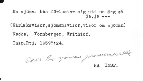 //// En sjömrn han förlustår sig uti en äng så //// ja,ja -- //// (Kärleksvisor,sjömansvisor,visor om sjömän) //// Nacka, ^örnberger, Frithiof. //// Insp.Rtj. 19397:24. //// RA INSP. ////