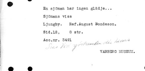 //// En sjöman har ingen glädje... //// Sjömans visa //// - //// * //// Ljungby. Ref.August Bondeson. //// Sid.12, 8 str. //// ^ //// /VARBERG mSEUIJ. //// ; ////