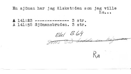 //// En sjöman har jag älskat: den som jag ville //// ha.. * //// * - < % . < i * //// A 141:23 --- 3 str. //// A 141:55 Sjömansbruden. 3 str. //// * ////