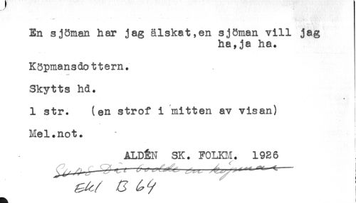 //// En sjöman har jag älskat,en sjöman vill jag //// ha,ja ha. //// Köpmansdottern. //// - - -<* //// Skytts hd. //// } //// 1 str. (en strof i mitten av visan) //// t //// Mel.not. //// < //// ! //// ALDÉN SK. FOLKM. 1926 ////