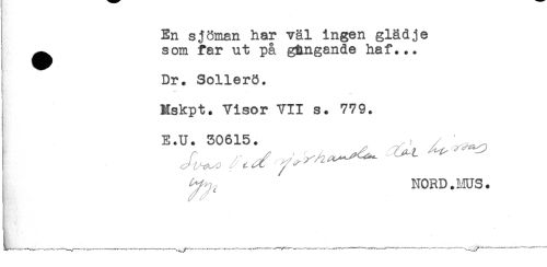 //// En sjöman har väl ingen glädje //// ^ som far ut på gängande haf... //// Dr. Sollerö. //// { //// Mskpt. Visor VII s. 779. //// E.U. 50615. , , //// ^ ^ NORD.MUS. ////
