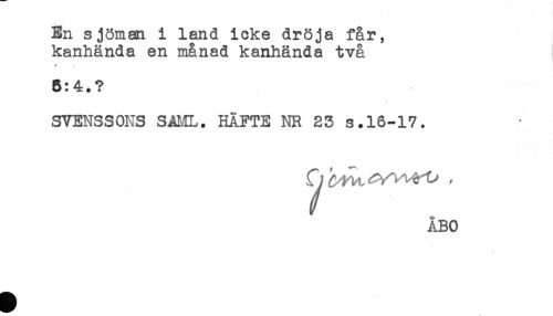 //// En sjöman i land icke dröja får, //// kanhända en månad kanhända två //// 8:4.? //// SVENSSONS S4ML. HÄFTE NR 23 s.16-17. //// ÅBO ////