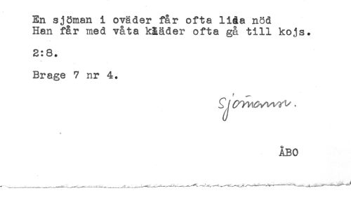 //// En sjöman i oväder får ofta lida nöd //// Han får med våta kääder ofta gå till kojs. //// 2:8. //// Brage 7 nr 4. //// ? //// ÅBO ////