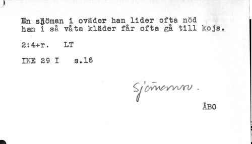 //// En s$8man i oväder han lider ofta nöd //// han i så våta kläder får ofta gå till kojs. //// -i //// 2:4+r. LT //// INE 29 I s.16 //// ÅBO ////
