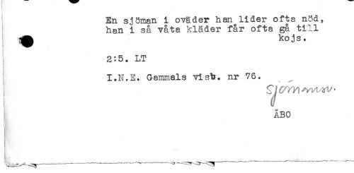 //// En sjöman i oväder han lider ofta nöd, //// han i så våta kläder får ofta gå till //// kojs. //// 2:5. LT //// I.N.E. Gammals vlsb. nr 76. //// ÅBO //// . ////