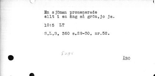 //// En s jöman promenerade //// allt i en äng så grön,jo ja. //// , //// 10:5 LT //// S.L.S. 360 s.29-30. nr.52. //// * //// _ ////