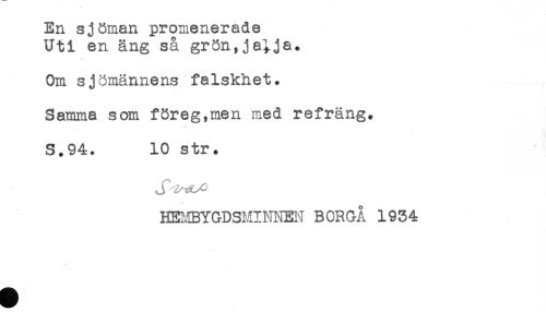 //// En sjöman promenerade //// Uti en äng så grön, ja^.ja. //// Om s j ömannens falskhet. //// Samma som föreg,men med refräng. //// S.94. 10 str. //// HS.IBYGDSMINNEN BORGÅ 1934 ////