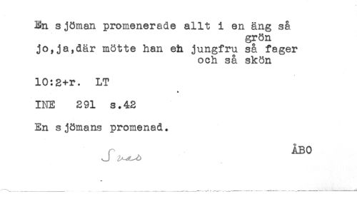 //// En sjöman promenerade allt i en äng så //// grön //// jo,ja,där mötte han eh jungfru så fager //// och så skön //// 10:2+r. LT //// INE 291 s.42 //// En sjömans promenad. //// ÅBO ////