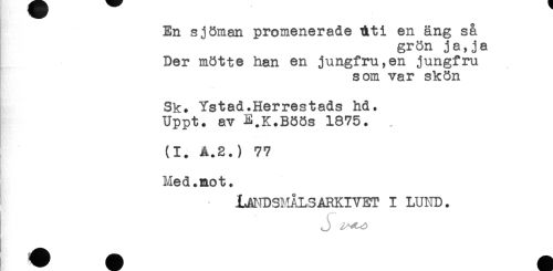 //// En sjöman promenerade dt i en äng så //// grön ja,ja //// Der mötte han en jungfru,en jungfru //// som var skön //// Sk. Ystad.Herrestads hd. //// Uppt. av E.K.Böös 1875. . //// (I. A.2.) 77 //// Med.mot. //// LAI-IDSMÅLSARKIVET I LUND. ////
