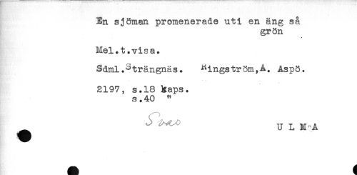//// R - , . //// En sjöman promenerade uti en äng så //// grön //// * //// Mel.t.visa. //// Sdml.Strängnäs. Ringström,A. Aspö. //// 2197, s.18 kaps. //// s.40 " //// ^ U L N-A ////