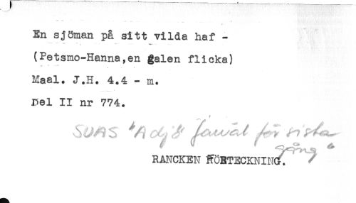 //// ** ^ - - - - - . .. - .... //// En sjöman p& sitt vilda haf - //// ^ ' *'*- .- ... . //// (Petsmo-Hanna,en galen flicka) //// < . . //// Maal. J.H. 4.4 - m. //// ... * //// Del II nr 774. //// A-^Åv ^ ^ //// RANCKEN ROETECKNINC. ^ ////
