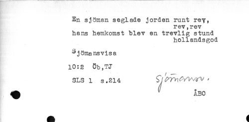 //// ' * ' * ' . //// En sjöman seglade jorden runt rey, //// rev,rev //// hans hemkomst blev en trevlig stund //// hollandsgod //// ^jömansvisa //// 10:2 8b,TJ //// SLSl s.214 Q^^yi/ ^ //// ^ ^ IB. ////