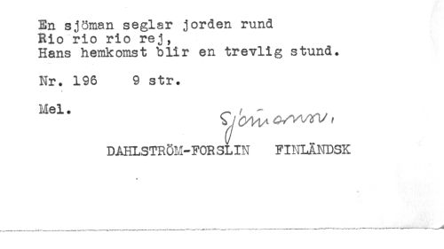 //// En sjöman seglar jorden rund //// Rio rio rio rej, //// Hans hemkomst blir en trevlig stund. //// Nr. 196 9 str. //// DAHLSTRÖM-FORSLIN FINLÄNDSK //// w ////